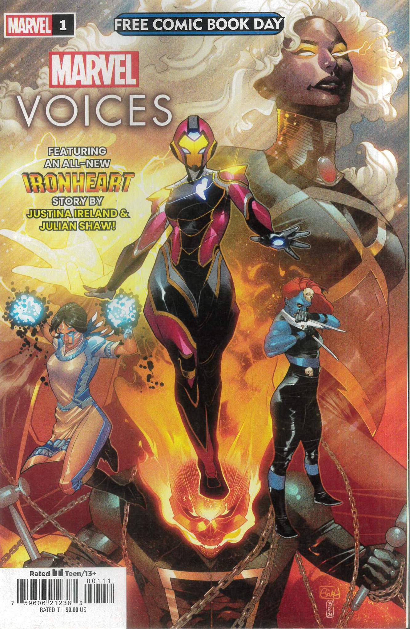 (W) Justina Ireland, Various (A) Various (CA) Galmon, Edwin. CELEBRATING A YEAR OF MARVEL’S VOICES WITH A BRAND-NEW STORY STARRING IRONHEART! Bestselling writer Justina Ireland blasts Ironheart into Chicago’s past for a story of Black innovation through the ages! And explore the past year of Voices anthologies with selections from Mystique and Destiny’s star-studded wedding issue, Patriot’s explosive return to super-heroing, the introduction of a brand-new Ghost Rider and more!’ Exclusive Original Material RATED T